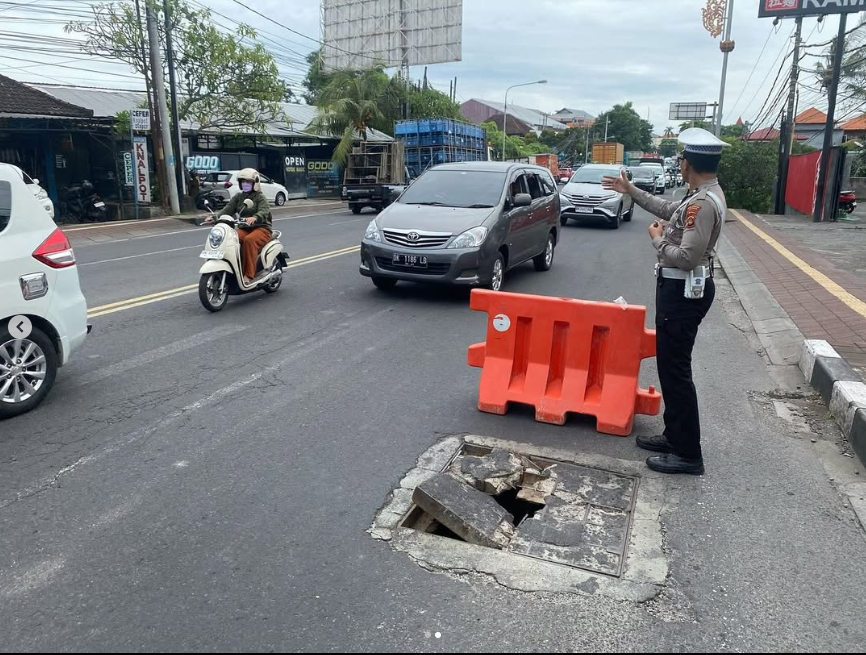 Denpasar – Pengguna jalan di sekitar Jalan Ayani, Denpasar, diimbau untuk lebih berhati-hati. Sebuah penutup gorong-gorong dilaporkan mengalami kerusakan di depan Dragon Ramen, tepat di sisi barat traffic light (TL) Ayani. Untuk mencegah potensi kecelakaan, personel Satuan Lalu Lintas (Satlantas) Polresta Denpasar telah memasang barrier sebagai langkah pengamanan sementara.