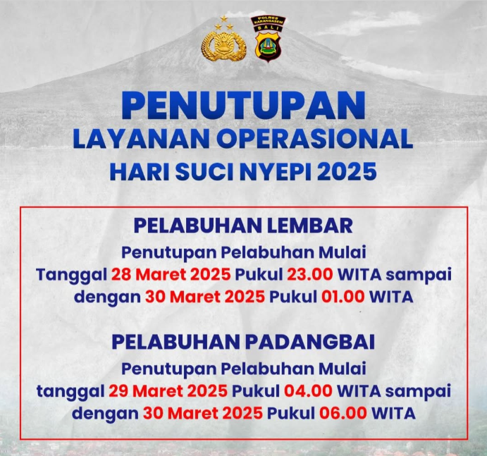 Dalam rangka memperingati Hari Suci Nyepi Tahun Baru Saka 1947, layanan operasional di beberapa pelabuhan utama akan ditutup sementara. Kebijakan ini diambil untuk menjaga ketertiban dan kekhusyukan perayaan Nyepi di wilayah Bali dan sekitarnya.