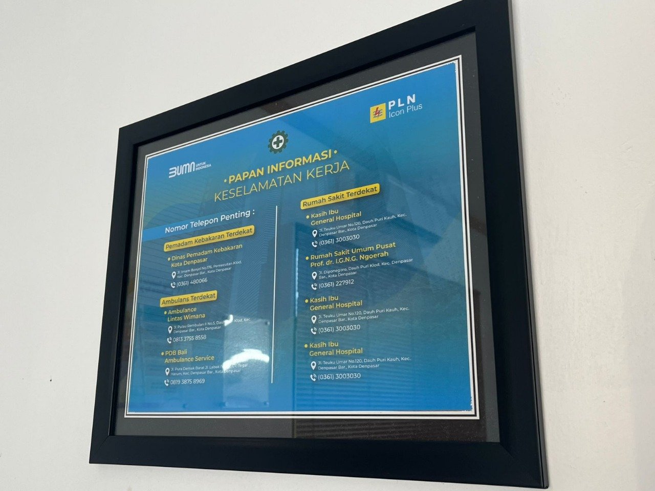 Denpasar, Mei 2025 — Dalam rangka memperkuat kesiapsiagaan dan respons cepat terhadap kondisi darurat, PLN Icon Plus SBU Regional Bali dan Nusa Tenggara memasang papan informasi keselamatan kerja di setiap gedung kantor dan fasilitas kerja. Papan ini memuat nomor-nomor penting seperti kontak pemadam kebakaran (damkar), ambulans, serta rumah sakit terdekat yang wajib diketahui oleh seluruh pegawai dan pengunjung.